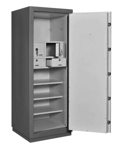 En su interior está diseñada para una organización superior, integrando un tesoro independiente para valores críticos, además de dos cajones y tres estantes que optimizan la distribución de grandes volúmenes de efectivo y documentación.