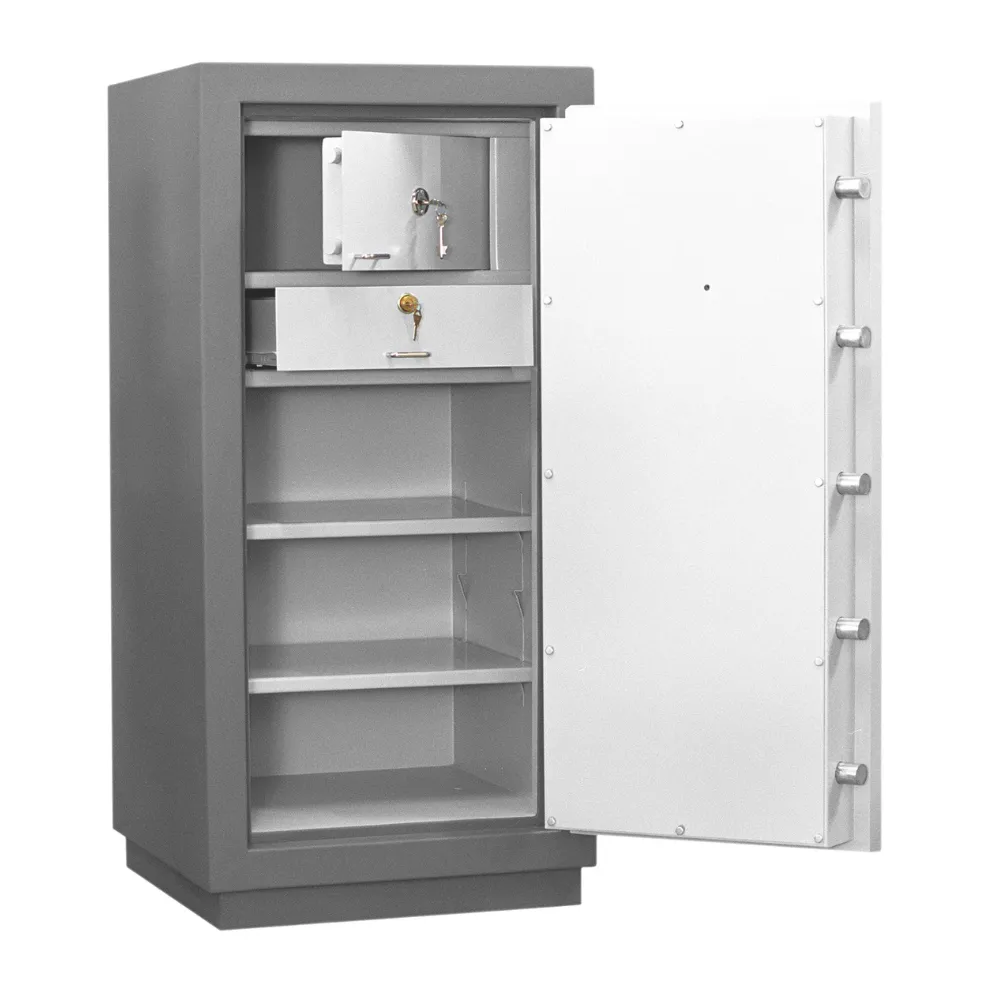 En su interior está diseñada para una organización superior, integrando un tesoro independiente para valores críticos, además de un cajón y dos estantes que optimizan la distribución de grandes volúmenes de efectivo y documentación.